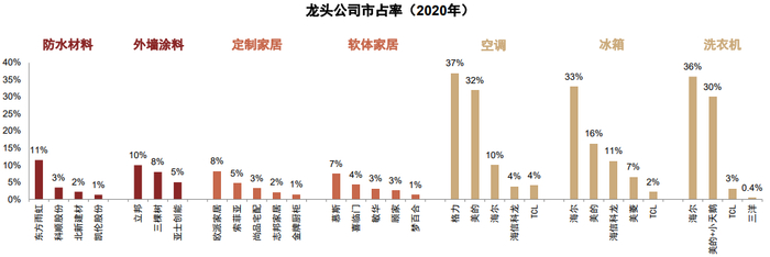 注:防水材料和外墙涂料龙头公司市占率以材料收入计算;定制家居和软体家居龙头公司市占率以公司收入计算;空调、冰箱和洗衣机龙头公司市占率以龙头公司内销出货量计算