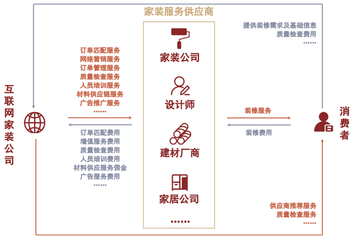 互联网家装公司作为信息中介赋能家装业务。互联网家装平台为消费者提供了一个新的线上消费场景,对家装服务供应商而言则是新的获客渠道与流量来源。互联网家装平台商业模式的本质为信息整合与业务撮合,即通过汇集交易各方的信息及需求,利用大数据技术为其节省信息搜寻与业务沟通的成本,也可基于大量的平台用户(C端消费者和B端家装服务供应商)开展相关的增值服务(例如To C的消费金融服务、To B的运营支持与集采服务)。因此,互联网家装平台之于家装产业链的角色仍更接近于流量端口,捕获的价值主要来源于削减传统渠道商所节省的交易费用,获取的收入主要来源于家装服务供应商的广告营销费用支出。