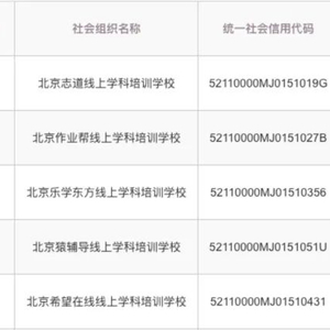 好未来总部所属的北京地区,12月7日,北京市民政局行政审批处发布了5个民办非企业线上学科类培训学校的行政许可决定书。这5家机构分别是,北京希望在线线上学科培训学校,北京志道线上学科培训学校,北京作业帮线上学科培训学校,北京乐学东方线上学科培训学校和北京猿辅导线上学科培训学校。