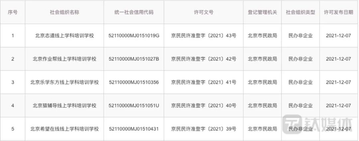 北京地区公示的5家民办非企业线上学科类培训学校,图来自北京市民政局官网