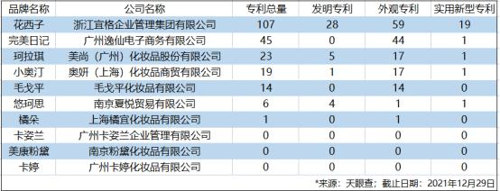 据天眼查显示,截止到2021年底,花西子母公司专利数量达到107项,比统计中其他9个知名国货彩妆品牌的总和还多。