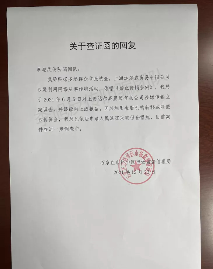 12月23日,石家庄市裕华区市场监督管理局回复李旭反传防骗团队查证函称,根据多起群众举报核查,上海达尔威贸易有限公司涉嫌利用网络从事传销活动,依据《禁止传销条例》,于2021年6月5日对上海达尔威贸易有限公司涉嫌传销立案调查,并逐级向上级报备。