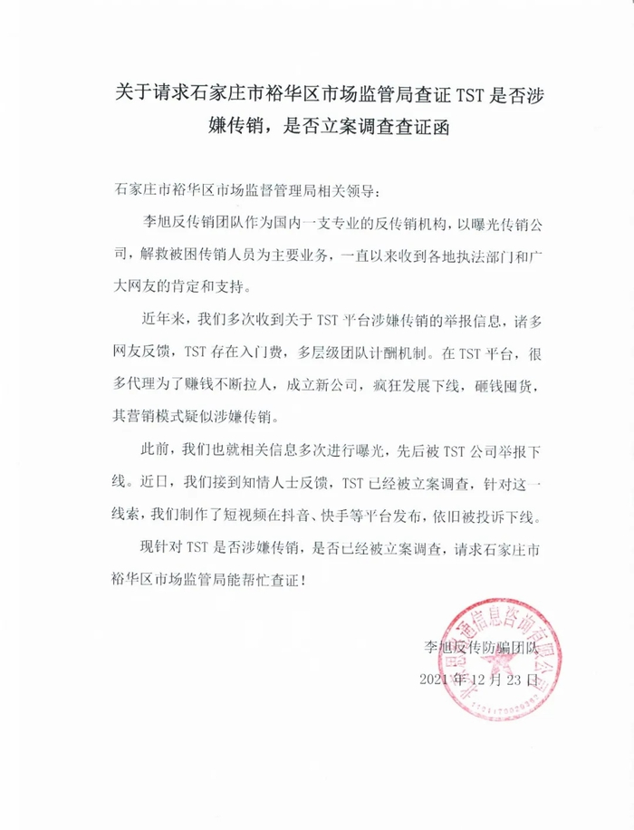 12月23日,李旭反传防骗团队“关于请求石家庄市裕华区市场监管局查证TST是否涉嫌传销,是否立案调查查证函”。 图源:李旭反传防骗团队