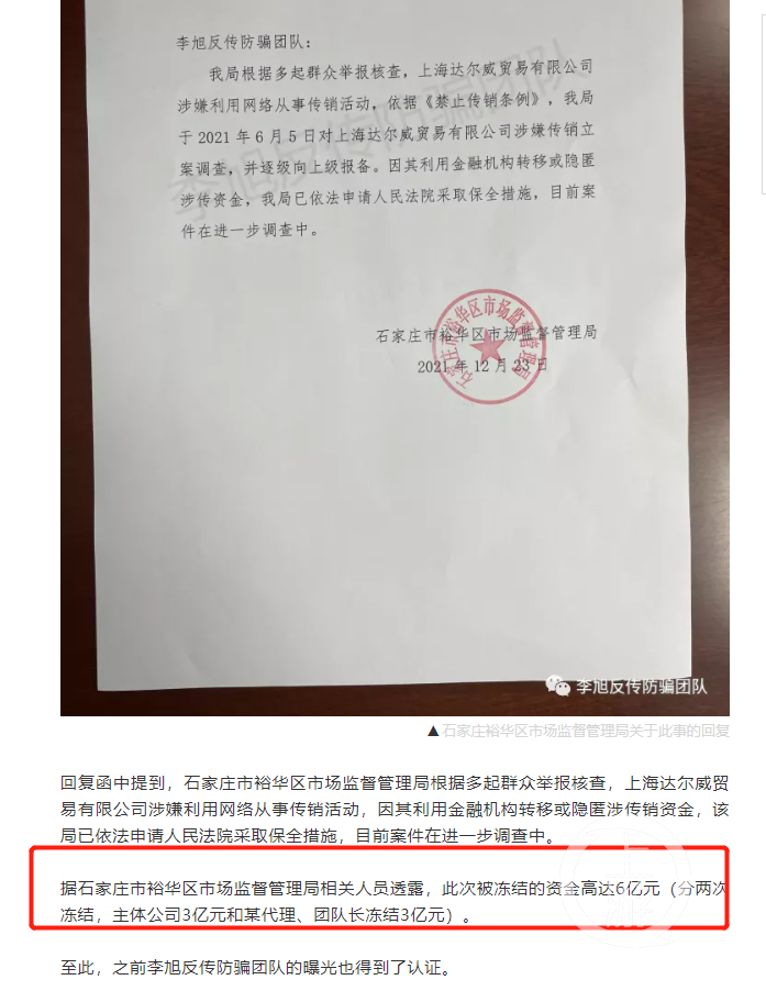 在长期揭露“TST庭秘密”的李旭反传防骗团队的公众号上,上游新闻记者看到发表于12月24日以《来!了!“TST庭秘密”涉嫌传销资金被冻结,官方回应属实》为题的文章,文章指出,石家庄有关部门对其举报已做了回复。文章指出,据石家庄市裕华区市场监督管理局相关人员透露,此次被冻结的资金高达6亿元(分两次冻结,主体公司3亿元和某代理、团队长冻结3亿元)。