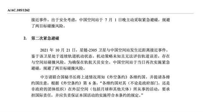 12月3日,中国常驻维也纳联合国和其他国际组织代表团向联合国秘书长递交普通照会,美国SpaceX太空探索技术公司发射的星链卫星今年曾两度接近中国空间站。出于安全考虑,中国空间站组合体两次实施紧急避碰。