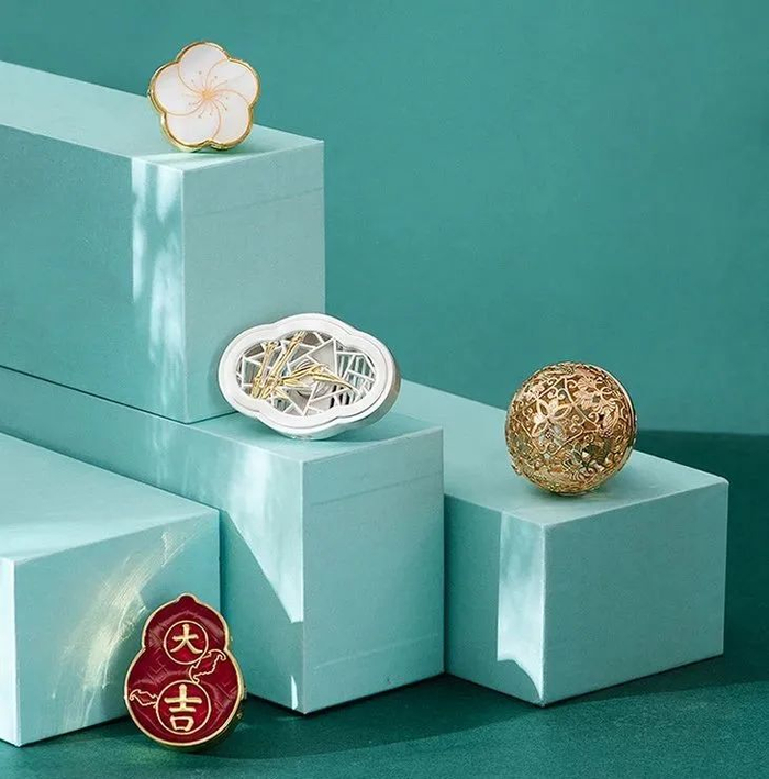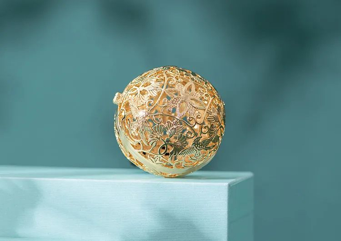 它源自唐·葡萄花鸟纹银香囊的造型,别致又小巧,不仅不遮挡视线,还可作装饰点缀。