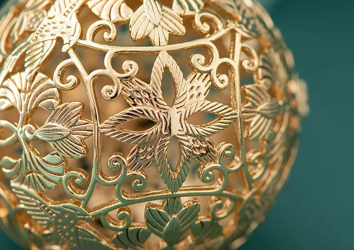 它做工巧妙,花纹自然婉转、分布均匀对称,华丽且精美;通体镂空,疏密考究,彰显盛唐时期古丝路的风格。