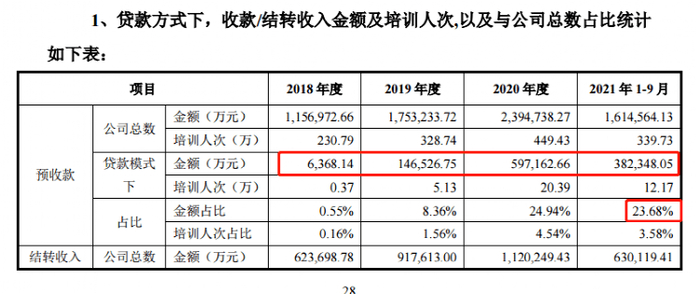 根据公司披露,贷款模式下近三年一期,公司合计预收款超过了100亿元。其中,2018年度6300多万元,2019年增至14.65亿元,2020年增至59.72亿元,2021年前三季度为38.23亿元。2020年和2021年贷款模式下的预收款占比分别为24.94%和23.68%,也就是说差不多每四个人有一个人使用贷款参加培训。