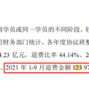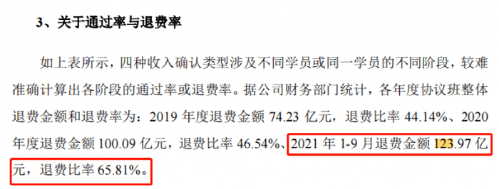据公司财务部门统计,各年度协议班整体退费金额和退费率处于快速上升状态,其中2019年度退费金额74.23亿元、退费比率44.14%,2020年度退费金额100.09 亿元、退费比率46.54%,2021年1-9月退费金额123.97亿元,退费比率 65.81%。2021年三个季度的退费金额就比2020年增长超过20%,接近三分之二的预收款发生了退费。