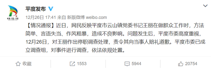 此前,平度市委宣传部26日发布情况通报称:问题发生后,平度市委高度重视,12月26日,对王丽作出停职调查处理,责令其向当事人赔礼道歉。平度市委已成立调查组,对事件进行调查,依法依规处置。