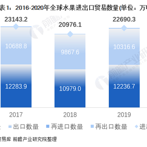 根据联合国商品贸易库,2016-2019年全球水果进出口贸易总量均在2亿吨以上,2020年全球水果进出口贸易总量为12512.8万吨,相较2019年下降44.9%,主要是由新冠疫情导致的进出口贸易受阻。
