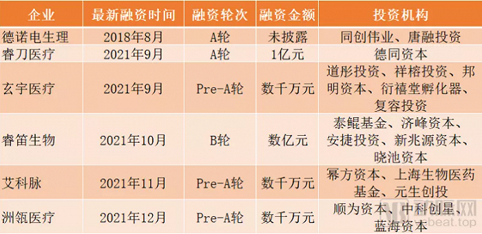 近期,脉冲电场消融技术相关企业纷纷获得资本青睐,如玄宇医疗、艾科脉、洲瓴医疗先后获得Pre-A轮数千万元融资,睿刀医疗于2021年9月完成亿元A轮融资,睿笛生物于2021年10月完成数亿元B轮融资。此前,德诺电生理曾于2018年获同创伟业、唐融投资等机构的投资。