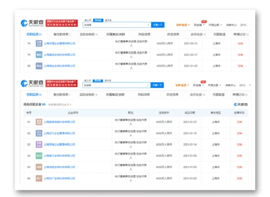 中国证券报·中证金牛座记者了解到,张庭曾在今年突击注销多家公司。天眼查显示,今年9月8日,由张庭(张淑琴)担任法定代表人、执行董事兼总经理的9家企业注销,包括上海浩广生物科技有限公司、上海运凡企业管理有限公司、上海振海信息科技有限公司、上海名理企业管理有限公司等,注销原因均为决议解散。这9家企业均成立于2021年,注册资本均为4500万元人民币。