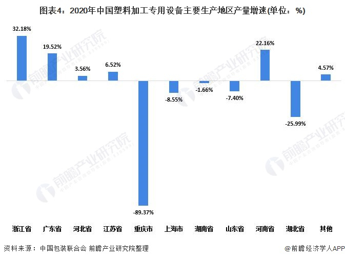 2020年在我国塑料加工专用设备的主要生产地区中,浙江省、河南省和广东省产量提升明显。其中浙江省产量同比增长32.18%,产量和产量增速均排在全国首位。