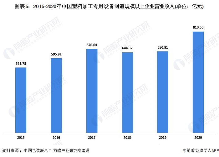 2020年中国塑料加工专用设备制造行业规模以上企业(年主营业务收入2000万元及以上全部工业法人企业)实现营业收入810.56亿元,同比增长21.05%。