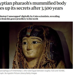 埃及考古学家扎希·哈瓦斯和开罗大学医学院放射学教授萨哈尔·萨利姆使用先进的X射线技术、CT扫描技术和先进的计算机软件程序,首次以“安全的非侵入、非接触”的数字方式“解封”阿蒙霍特普一世的木乃伊,并公布其面部特征、年龄以及被制作成木乃伊时的相关信息等。有关研究结果28日发表在《医学前沿》杂志上。