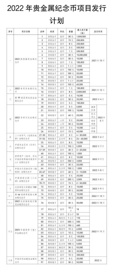 虽然央行还没有发布2022年普通纪念币发行计划,但是2022年贵金属纪念币项目发行计划已经有啦!涉及空间站、亚运会、吉祥文化、二十四节气等多个主题,快来看看有没有你钟意的。