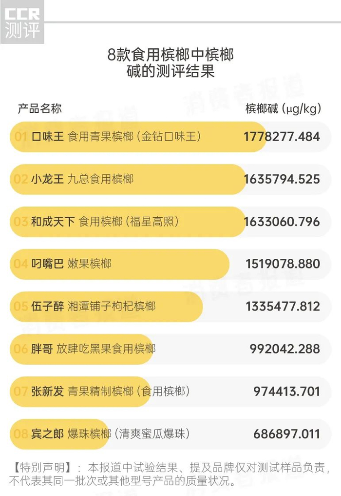 槟榔测评报告:“小龙王”、“和成天下”等槟榔碱含量较高,“叼嘴巴”更易灼伤口腔