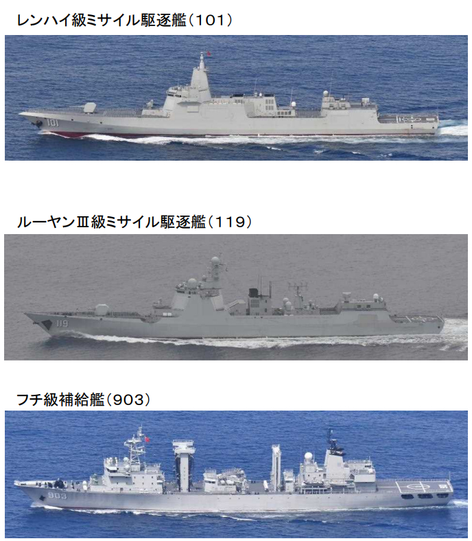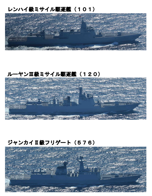 12月15日,日本自卫队在距日本长崎男女群岛以西约350公里的东海海域发现四艘中国海军舰艇向东南方向航行,分别是:航母辽宁舰、055型导弹驱逐舰南昌舰、054A型导弹护卫舰日照舰以及901型综合补给舰呼伦湖舰。