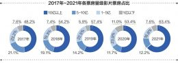 疫情阴霾下的2020年,票房10亿元+量级的头部影片数量、票房锐减,导致未过亿元的影片票房占比提升至一成以上(11%)。2021年,随着春节、国庆等重要档期电影市场的蓄力反弹,截至数据统计时间(2021年10月24日),10亿元量级以上的影片数量和票房双双恢复,以2.1%的数量占比为市场贡献了63.4%的票房,未过亿元影片数量及票房占比降至往年平均水平。