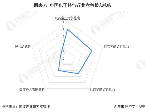 从五力竞争模型角度分析,目前,我国电子特气属于工业气体中的新兴领域,替代品威胁较小;市场集中度高,现有企业竞争程度激烈;上游供应商一般为气体原材料领域和空分设备,行业后向一体化能力强,对上游原材料议价能力较强;相较而言,电子特气产品集中供给于高新电子工业,受下游需求影响较大,具备综合管理能力的头部企业对下游议价能力较好,但中小型企业的下游议价能力则较差,综合来看行业对下游议价能力一般。同时,因行业存在技术门槛较高,潜在进入者威胁较小。