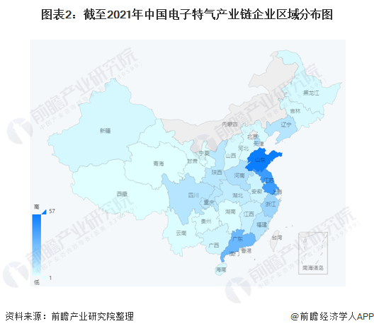 从我国电子特气产业链企业的区域分布来看,电子特气产业产业链企业主要分布在东部地区,其中以山东、江苏、广东省布局最为密集,浙江、河南等地分布数量也相对较多。