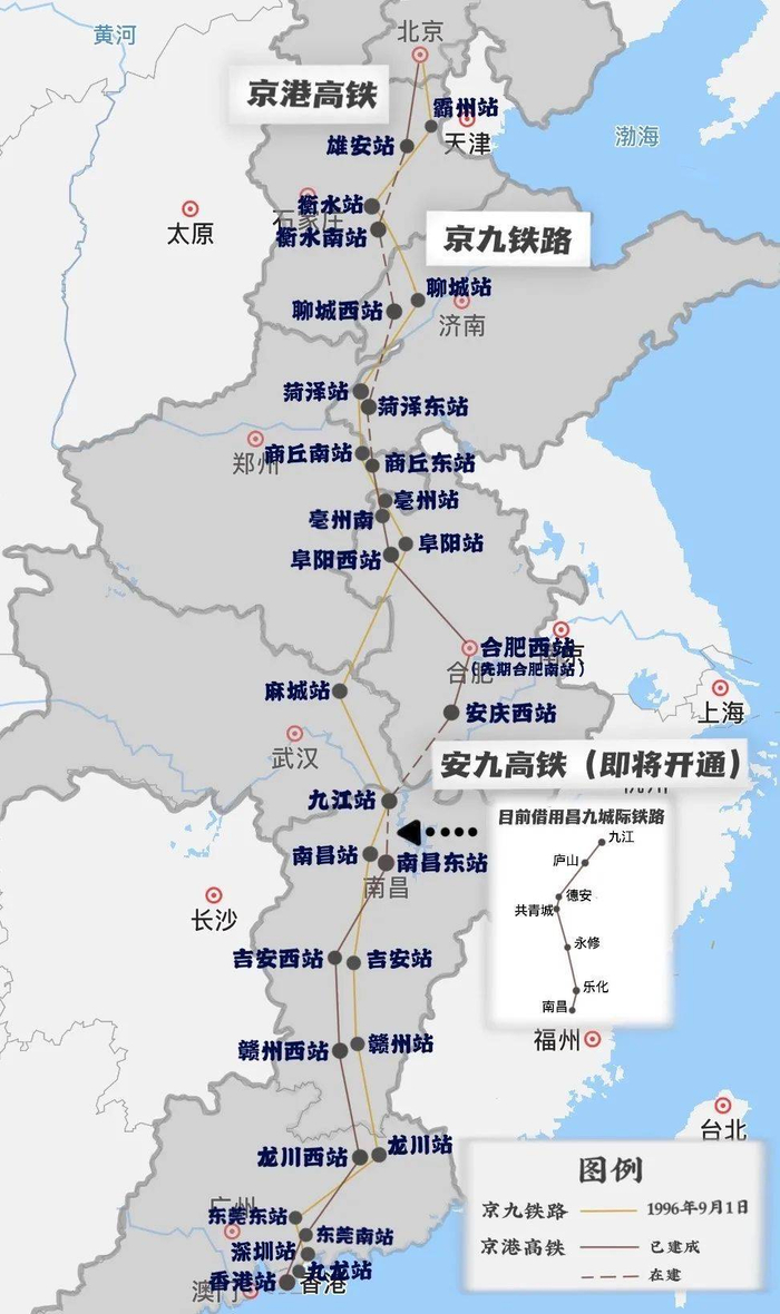 当然,京港高铁北段的雄商高铁仍在建设,九江至南昌段目前仍借道昌九城际,京港高铁的全线通车仍有时日。但改变已经发生!