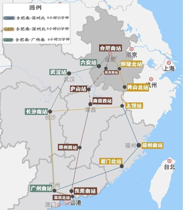 不难看出,合肥通往珠三角目前仍须借道,安九高铁的开通将能为前往广深节约不少时间。