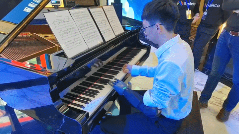 论坛现场,左臂残疾的古月在学习钢琴的第30天戴着BrainRobotics智能仿生手弹奏了一曲《我和我的祖国》。