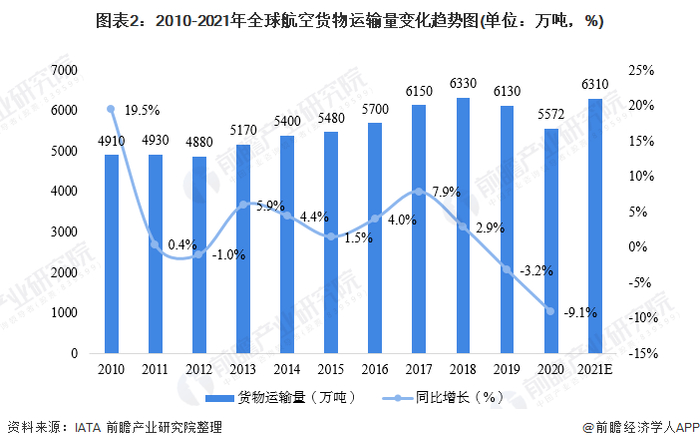 2020年新冠疫情席卷全球,航空产业是受疫情影响最严重的产业之一。相比于客运,航空货运得益于全球对疫苗等抗疫物资的运输需求,受疫情影响相对较小,但仍然遭受巨大打击。