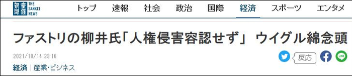 《产经新闻》10月14日报道:在新疆棉花一事上,柳井正表达“绝不容许侵犯人权”的态度