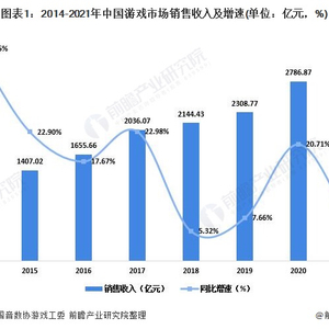 2021年,我国游戏市场销售收入2965.13亿元,较2020年增长了178.26亿元,同比增长6.4%。2021年随着疫情缓解,宅经济影响减弱,我国游戏市场销售收入增速有所下降。
