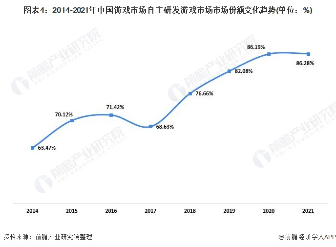 从自主研发游戏占全游戏市场收入的比重来看,我国自主研发游戏市场份额持续提升,到2021年,我国自主研发游戏占国内市场的比重已提升至86.28%。