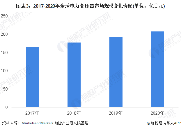 根据电力变压器市场研究报告,2017-2020年全球电力变压器市场呈现稳定增长态势,复合年增长率为8.20%;2020年全球电力变压器市场规模突破200亿美元。