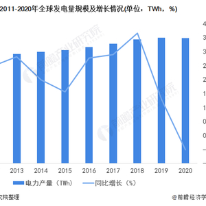 根据英国石油公司发布的《BP Statistical Review of World Energy June 2021》的报告数据显示,2011年以来,全球电力生产规模平稳增长,2011-2020年,全球电力生产规模增速整体维持在1.3%-4.0%之间,到2020年,全年电力生产总量为2TWh,同比增长1.3%,增速有所放缓。