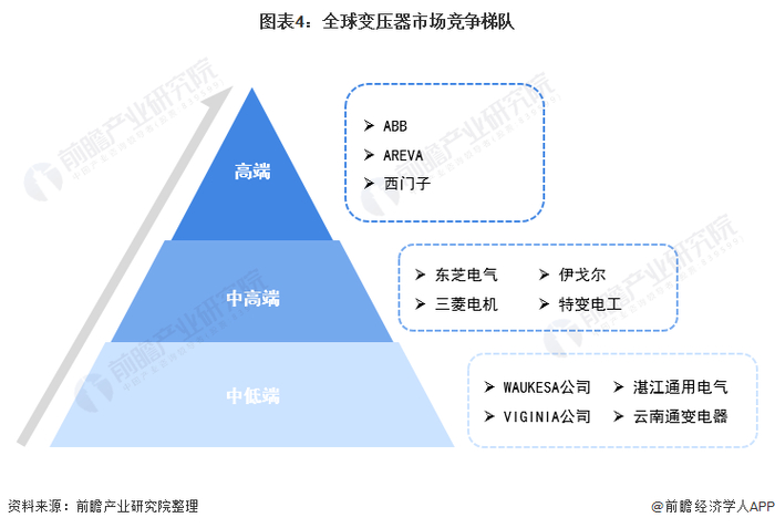 从电力变压器企业竞争角度来看,目前全球变压器企业竞争梯队已基本形成,大致可分为三个梯队。第一梯队主要包括ABB、AREVA、西门子等跨国企业;第二梯队主要是国内外领先变压器企业,包括东芝电气、伊戈尔、三菱电机、特变电工等。第三梯队主要包括WAUKESA公司、VIGINIA公司、湛江通用电气、云南通变电器等。