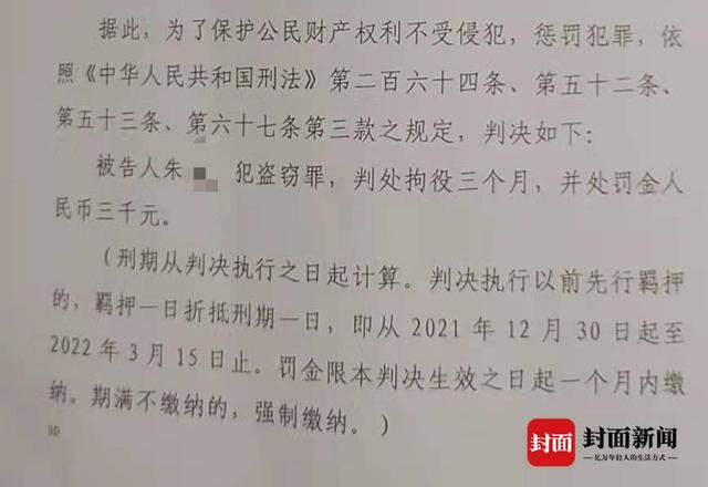 法院:朱某构成盗窃罪 拘役3个月处罚3000元