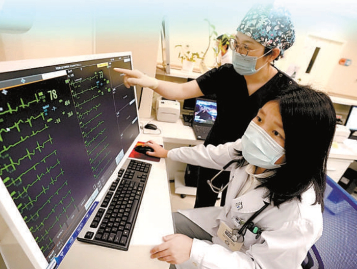 在研究型病房,医护人员通过心电遥测系统为受试者进行安全性数据监测。