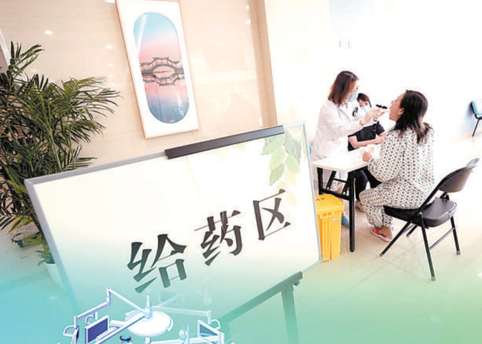 在研究型病房给药区,医务人员对受试者进行试验用药物给药及口腔检查。