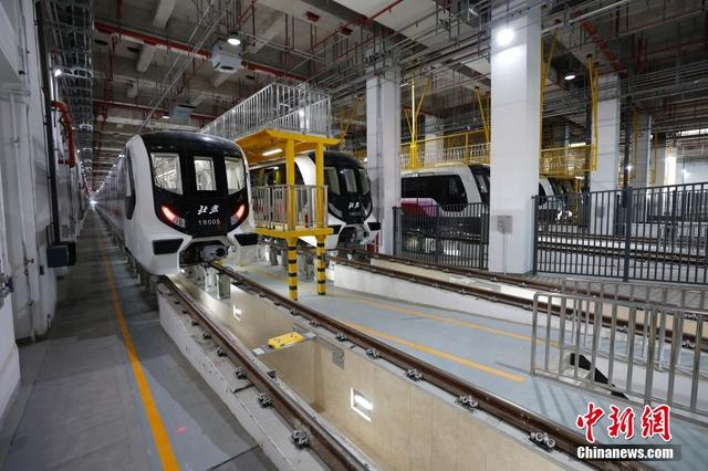 12月29日,被命名为“虎鲸号”的地铁19号线列车在新宫车辆段内。该线路采用A型8编组列车,考虑到接驳大兴机场线大件行李旅客的需求,该型列车设计2节“特别”车厢,车厢内设置左右两边单列单座的高铁同款座椅,乘客可将大件行李放在座位侧边,避免车厢内拥挤。北京地铁19号线一期工程已具备全线开通运营条件,即将实现初期运营。该线是北京首条穿越中心城区的大运量快线,从南四环外的新宫站到北三环外的牡丹园站仅需24分钟。 中新社记者 富田 摄
