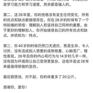 第三,你40岁的时候仍然口无遮拦、惹是生非、令人讨厌,没有活成别人想要的成熟稳重、心胸宽广、理性客观。26年后你的内心和行为与14岁时几乎一样,没有因为环境而让自己变得更复杂,这或许是这26年来最值得骄傲的坚持。