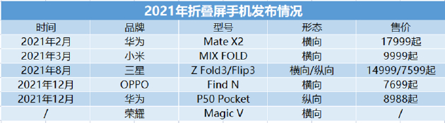 睿财经讯(文/萧玮)2021年对手机行业来说是折叠手机年,华为、OPPO、小米、三星等主流手机厂商均发布了量产版折叠屏手机。华为在今年一共发布两款折叠屏手机Mate X2和P50 Pocket,起售价分别是17999元起和8988元;3月份小米发布MIX FOLD,起售价为9999元;三星在8月份发布 Z Fold、Flip 3两款折叠屏手机,起售价分别是14999元和7599元起;12月份OPPO发布 Find N折叠屏手机,起售价为7699元。