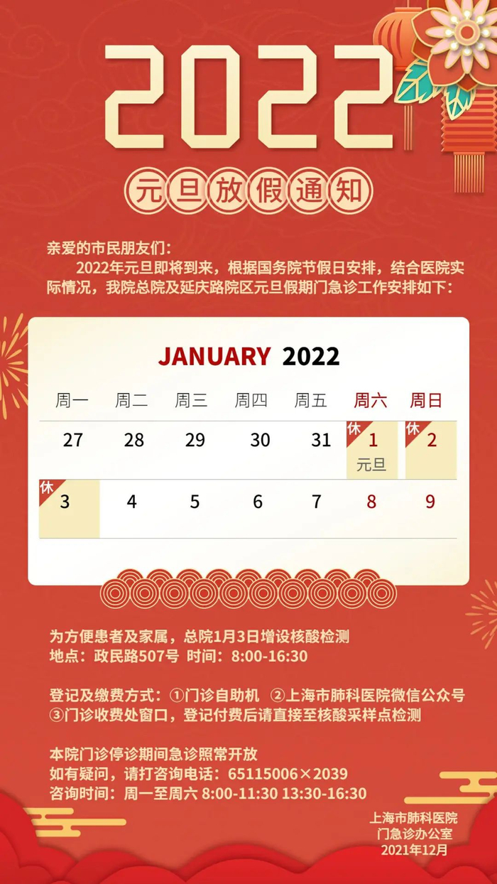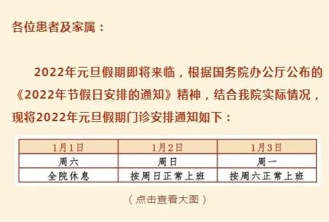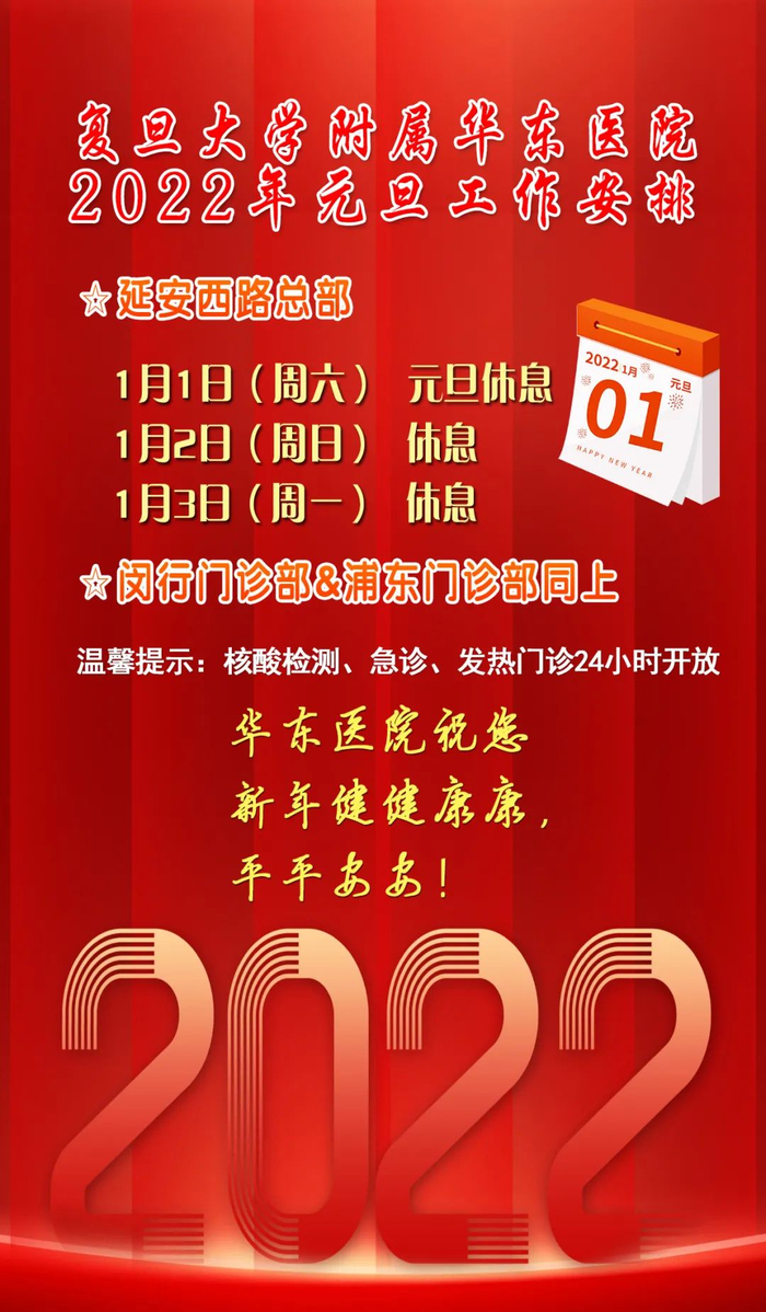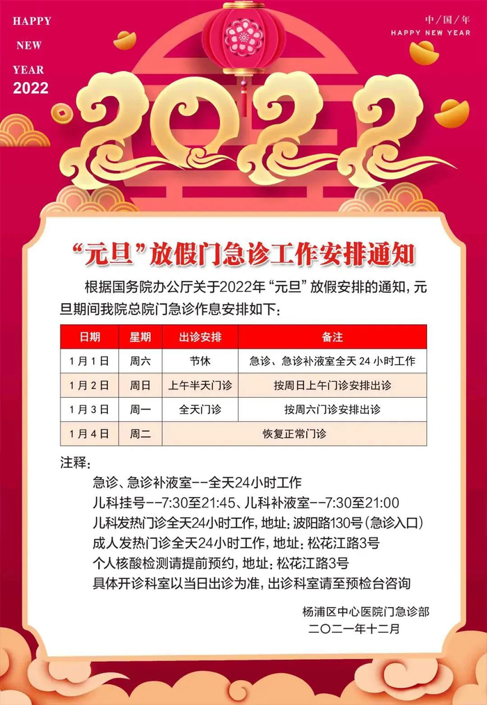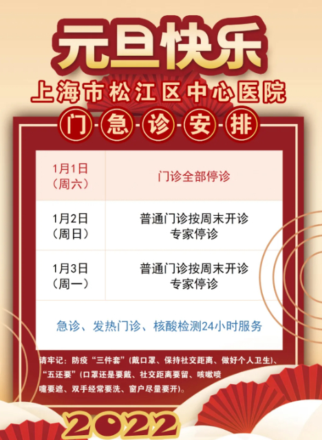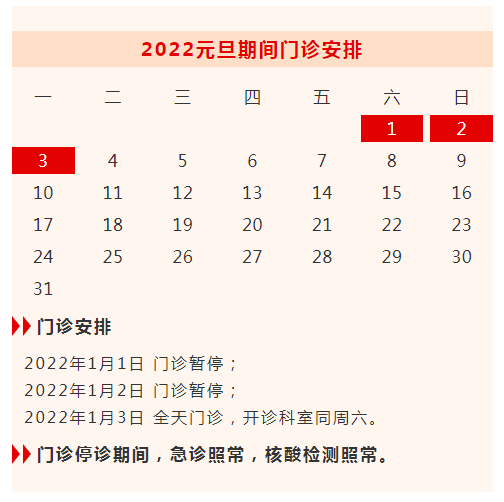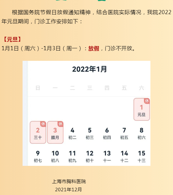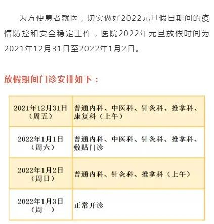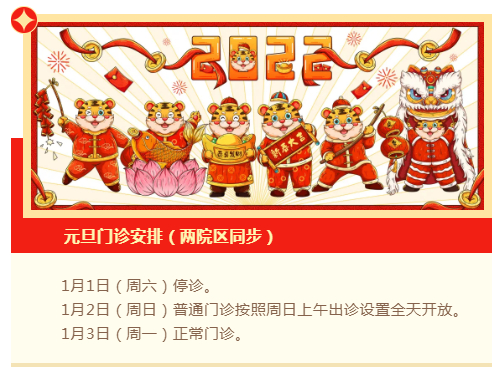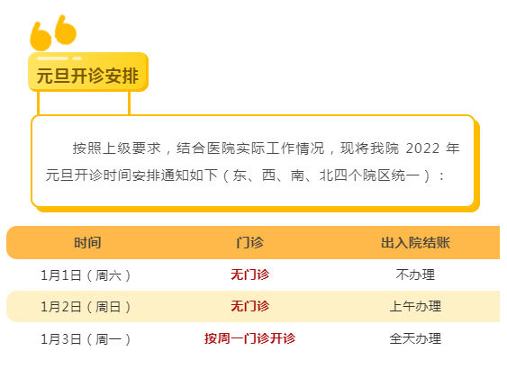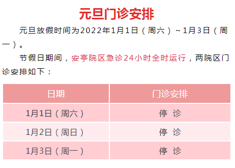 市卫健委提示,2022年“元旦”假期即将到来,本市三级医院的门急诊放假安排(部分医院假期安排待更新)详见↓