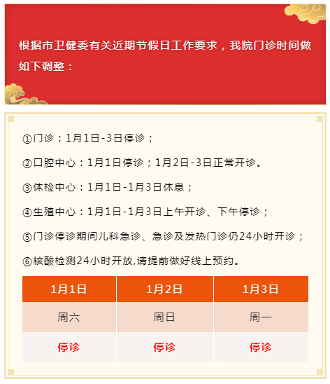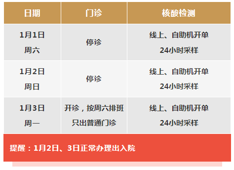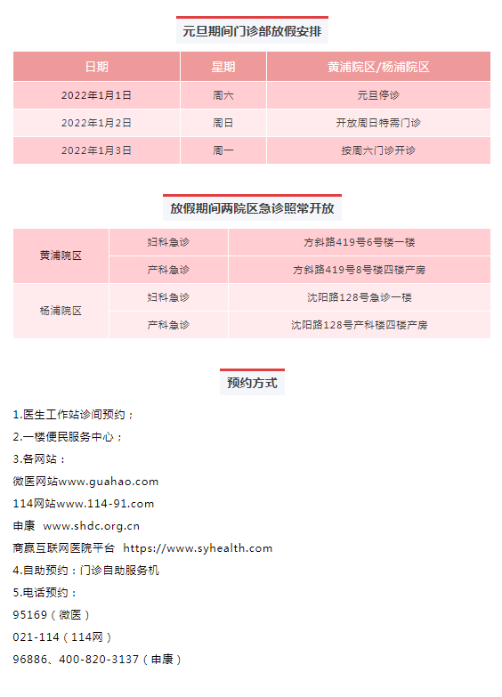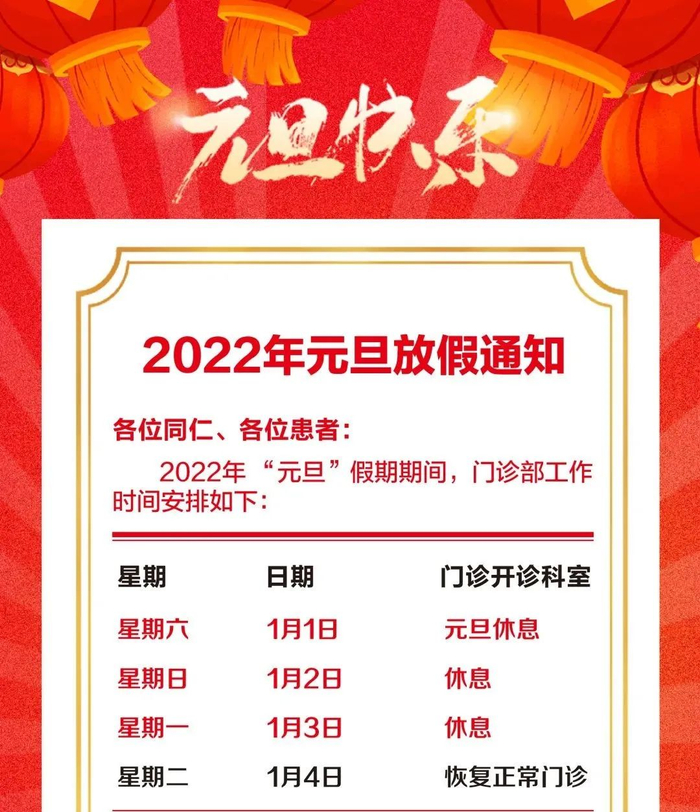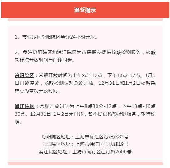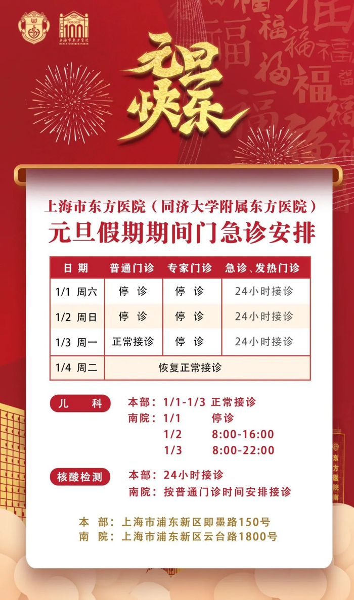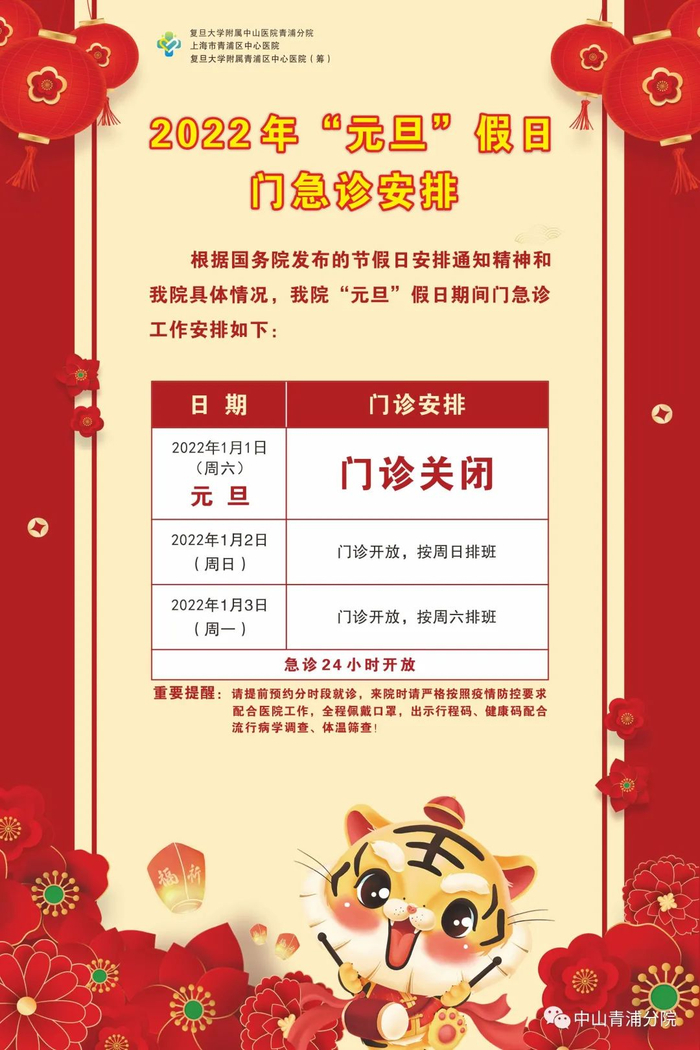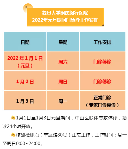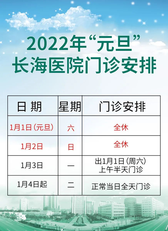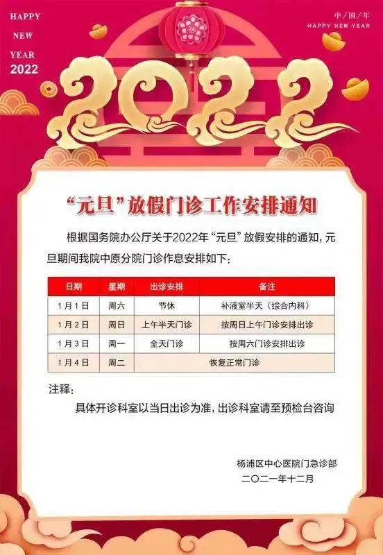 市卫健委提示,2022年“元旦”假期即将到来,本市三级医院的门急诊放假安排(部分医院假期安排待更新)详见↓