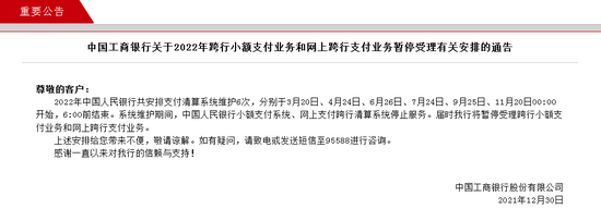 中国工商银行官网12月30日发布两条通告,内容如下: