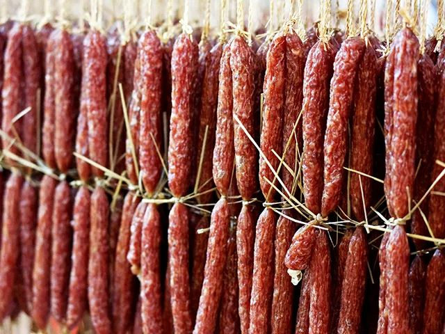 做好的香肠,还需进行充分的晾晒,直至把香肠彻底晒干成腊肠。