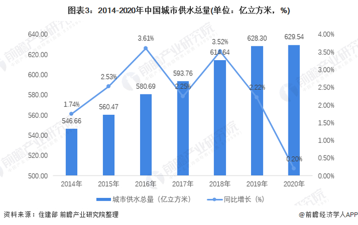 随着中国城市供水综合生产能力的提升,供水量也快速增长,2020年中国城市供水总量达629.54亿立方米,较2019年增长0.20%,较2014年增长15.16%。