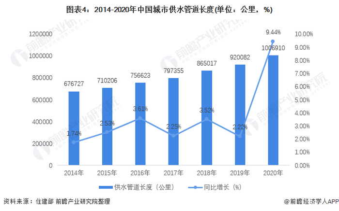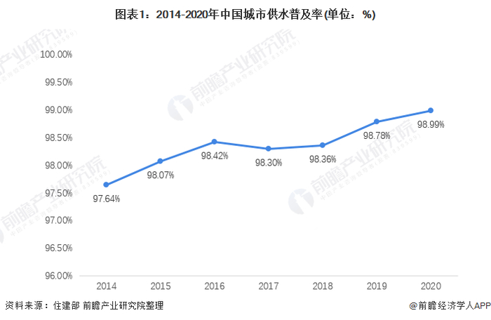 根据住建部数据,近年来我国城市供水普及率一直相对饱和,2020年为98.99%,2014-2020年仅增长了1.35%。