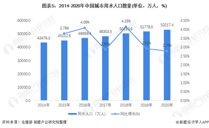 2014年以来城市用水人口数量不断增加,2020年中国城市用水人口数量达53217.4万人,较2019年增加了1439.34万人,同比增长2.78%,较2014年增长22.41%。