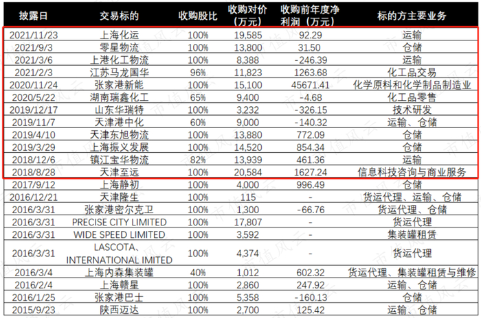 2018年上市以来,公司加快了其收购步伐,累计收购12笔,收购对价合计已高达15.3亿,涉及业务主要为货运代理、运输、仓储等物流业务以及化工品交易。